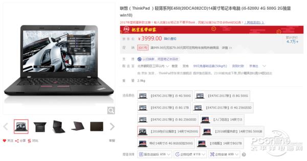 我們首先去JD查詢下ThinkPad E450,是JD銷量前十的機(jī)器。我們可以看到自營(yíng)共有七款E450,價(jià)格分布為2999元到4999元,共分布在兩個(gè)頁(yè)面中,其中有一個(gè)頁(yè)面為E450單獨(dú)的銷售頁(yè)面,為E450金屬系列,僅有兩款不同配置的產(chǎn)品,另一個(gè)頁(yè)面則是與E470混合在一起的頁(yè)面,為E450輕薄系列,不過(guò)E470的出現(xiàn)也證明這將是升級(jí)產(chǎn)品替換老一代產(chǎn)品的節(jié)奏。