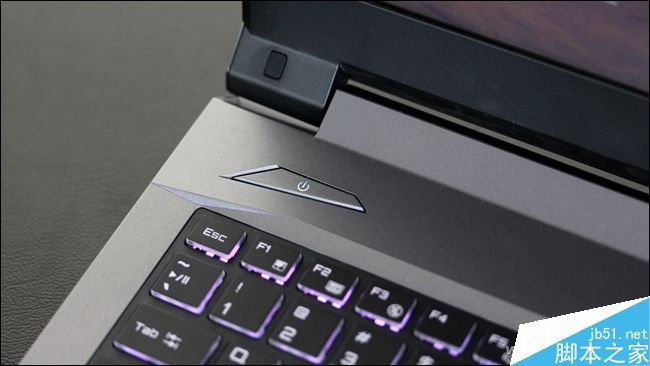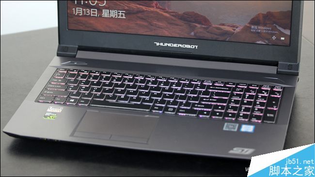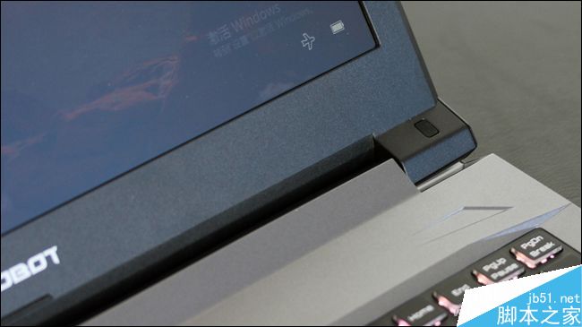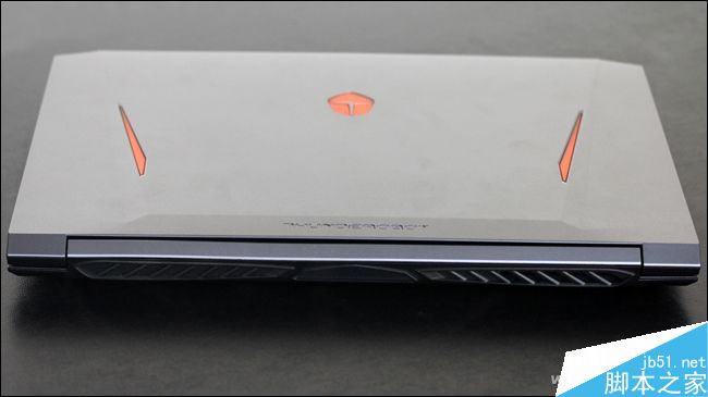 這款產品的A面通過幾道脊線有了更為立體的設計感,中間的雷神Logo和兩道細長三角裝飾條內還隱藏著LED背光燈,開機后可以泛出橙色的背光,煞是好看。