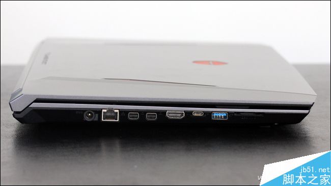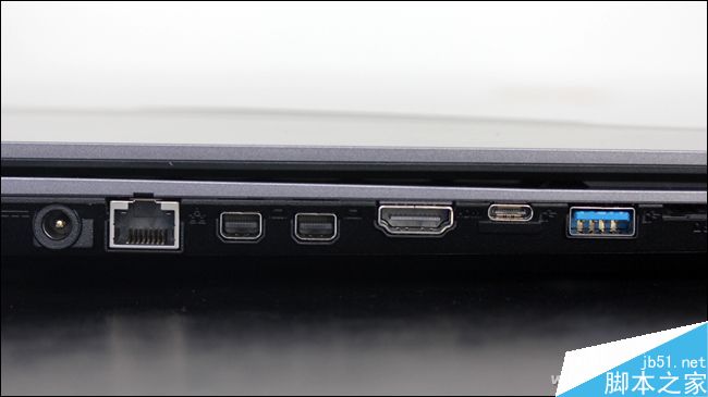 雷神ST Plus的接口種類和數量都非常豐富。機身左側依次提供了電源孔、RJ45、2個miniDP、HDMI、USB Type-C、USB3.0和讀卡器。