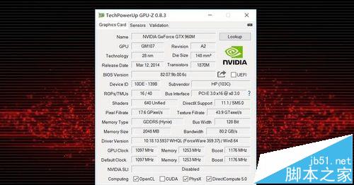 4、惠普暗影精靈II代升級了NVIDA GeForce GTX 960M中端獨顯,它采用GM107麥克斯韋核心,擁有640個流處理器,核心頻率為1097MHz,顯存位寬128bit、顯存容量2GB、顯存類型為GDDR5,這塊顯卡可以說是我們的老朋友了,那么暗影精靈II代能否發揮這款顯卡的全部性能呢?