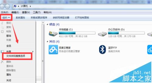 1、在我的電腦中,打開任意一個文件,在“工具欄”找到“組織”選項卡,點擊“文件夾和搜索選項”。