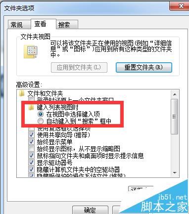 2、切換到“查看”選項卡,在列表單找到“鍵入列表視圖時”的子項,把“自動鍵入到‘搜索’框中”改為上面一個“在視圖中選擇鍵入項”就可以了。