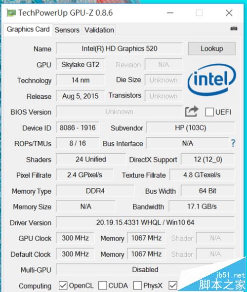 2、GPU-Z是目前對(duì)顯卡檢測(cè)最好的軟件,也是各大媒體最常用的測(cè)試軟件,GPU-Z可以詳細(xì)的檢測(cè)出電腦顯卡的參數(shù),無(wú)論是核芯顯卡還是獨(dú)立顯卡都能檢測(cè)。下面就來(lái)看看惠普這款筆記本的顯卡。通過(guò)GPU-Z的檢測(cè),可以看出惠普這款筆記本采用的是核芯顯卡,搭載的是英特爾核芯HD 520顯卡,這款顯卡對(duì)于現(xiàn)在的商務(wù)辦公還是沒(méi)有任何壓力的。