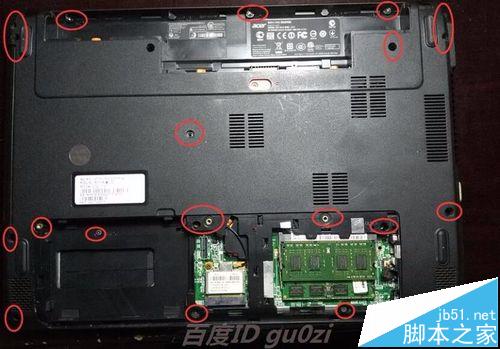 2、拆下電池下的3個螺絲,再將D殼上看得到的螺絲全部拆下,拆下硬盤和內存蓋板后,將其下的幾個螺絲也拆下,