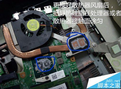 4、然后,開始拆筆記本主板上的散熱器螺絲,把散熱器去掉后再拆散熱器風(fēng)扇上的螺絲,如圖,接下來更換好散熱器風(fēng)扇后,把導(dǎo)熱硅脂在處理器或者散熱器接觸面涂勻再進(jìn)行固定即可。