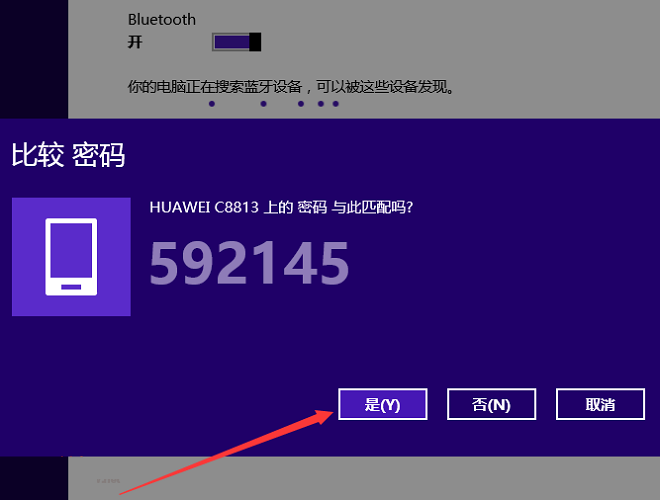 4. 如圖所示“出現配對準備已就緒”,點擊“配對”按鈕,系統會自動生成比較密碼,點擊“是”,同時手機也點擊配對。