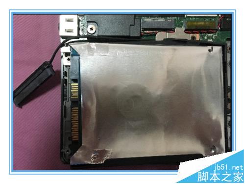 6、拆開后整個主板的左下角亮亮的部分就是硬盤位置了,直接就可以看到,先把主板與硬盤連接的SATA排線從硬盤上拆出。整個硬盤周圍是一層橡膠圍圈,上面有軟卡座卡住硬盤上的螺絲位。