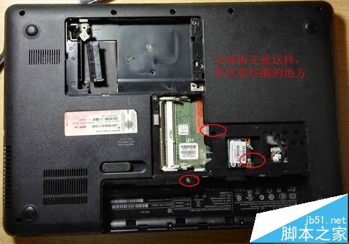 2、把后面全部螺絲旋掉,多注意我畫紅圈的地方,不把螺絲旋掉,電腦前面蓋子是拿不掉的。