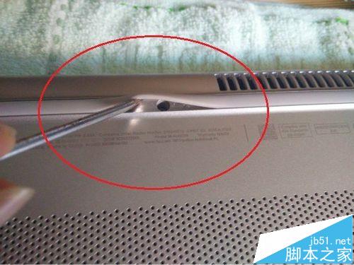 2、把筆記本放在毛巾上后開始用十字螺絲刀拆卸螺絲,螺絲我已經幫你們標出來了,拆卸過程中要記住每個螺絲的位置,不可搞混