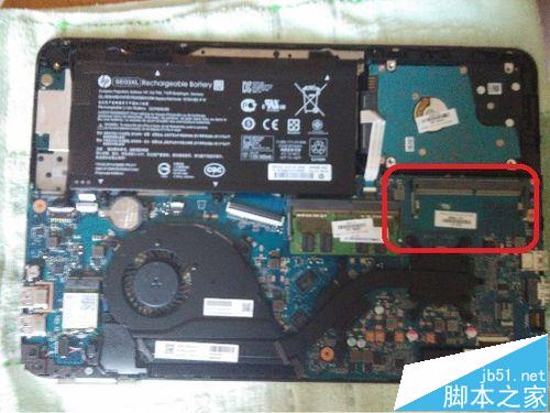 5、撬完一圈后拿開蓋子是這樣的,標記處就是內存空位,加內存時先斜插好,然后往下按聽到咔嚓一聲即可