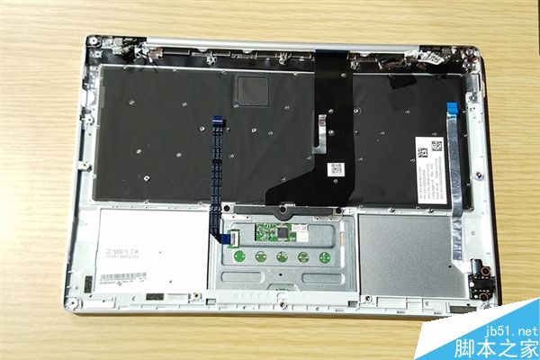拿開主板、電池后的筆記本B面后殼,我們可以看到上方是鍵盤背面,下方中間位置是觸控板背面。