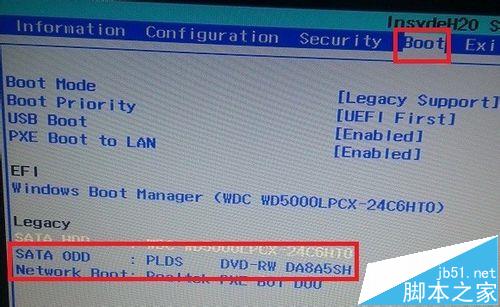 1、用剛才的方法繼續道第3步,打開BIOS設置界面,用左右鍵切換到“Boot”并選擇找到DVD字樣的選項或者USB字樣的選項并回車。