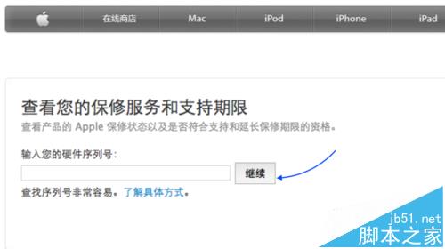 2、接著請打開蘋果官網的機器序列號查詢頁面地址:https://selfsolve.apple.com/agreementWarrantyDynamic.do?,輸入在機器背面看到的序列號,如圖所示