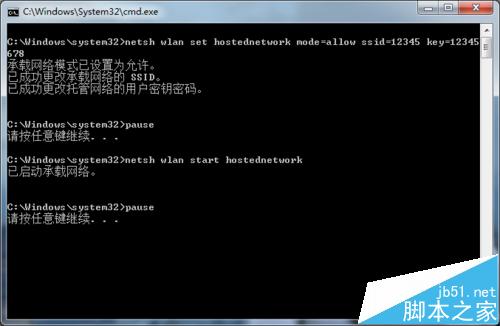 6、接下來我們可以看到運行后出現如圖所示的畫面,一定要看到提示”承載網絡模式已設置為允許,成功更改SSID,成功托管用戶密碼。確保每一步操作都有效。