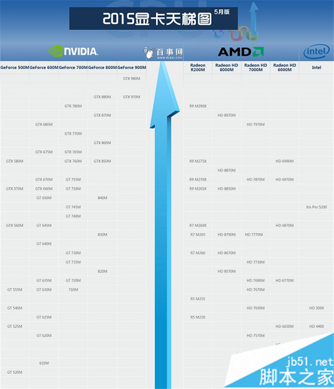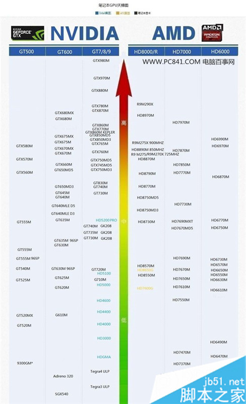 顯卡、筆記本顯卡主要廠商也是兩家,AMD和N卡大家根據各自所需,來選擇自己所需的配置即可。下面小編附上筆記本顯卡天梯圖。不過小編建議大家選購2G的獨立顯卡,另外顯存類型,最好是GDR5類型的,GDR3顯存性能偏低。