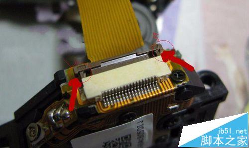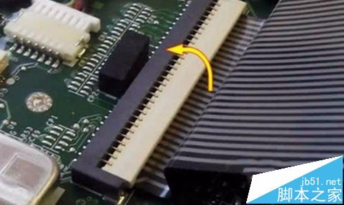 2、暗扣排線(xiàn),如圖,用鑷子將兩邊的扣朝箭頭方向退,鎖扣就開(kāi)了,向外輕拉排線(xiàn)就可拉出
