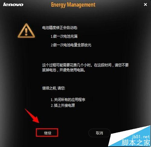 4、修復(fù)電池會(huì)自動(dòng)把電池沖滿和把電池用完,這個(gè)時(shí)間會(huì)比較久,所以我每次都是晚上修復(fù),把電腦上的所有的程序都關(guān)閉了,再確定外接電源已接上點(diǎn)擊【繼續(xù)】