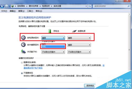 3、在“按電源按鈕時”之后的下拉菜單中選擇關機,用電池和接通電源的情況根據自己需要選擇。