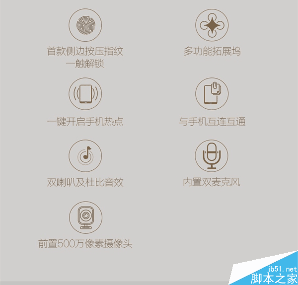 8、首款側面按壓指紋一鍵解鎖,多功能擴展塢,一鍵開啟手機熱點,雙喇叭和杜比音效,雙麥克風,500萬像素攝像頭。
