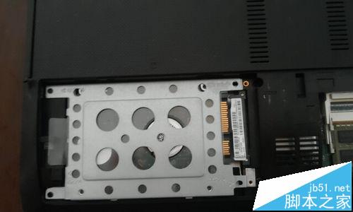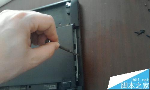 11、把電腦翻過來背面朝上,在剛才抽走的光驅這個框架這里,有一個很細小的螺絲,把它也擰下來。