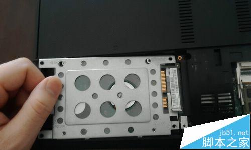 3、然后,將左側的電腦硬盤取下來。在那個白色固定架上有螺絲,注意先擰下來。然后固定架的左側有一個白色的塑料片,用手捏往左上方,輕輕的拽它,角度不要太高,以防把硬盤接口拽壞。