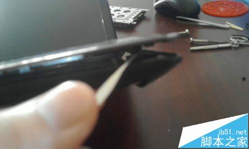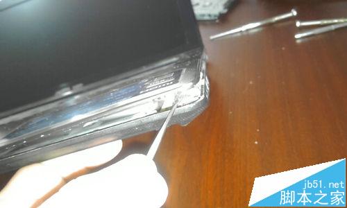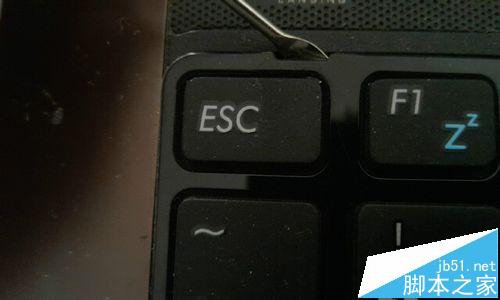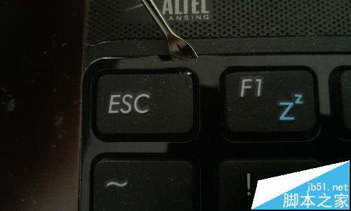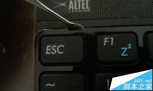 6、從圖上,我們可以看到,在鍵盤的四周每隔一段都會有一個小缺口,我們用掏耳朵勺輕輕的撬開它們。先撬開鍵盤最上面的一行。然后再撬兩側。