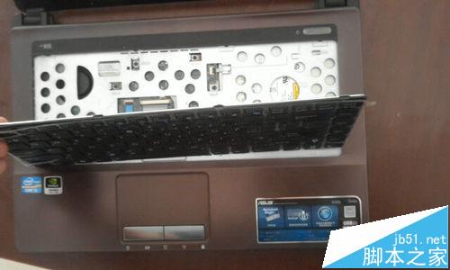 7、撬開之后,輕輕地將鍵盤向上抬起來,抬的時候,只抬鍵盤的上部分,下部分盡量不要懸空,以防止把鍵盤的數據線扯壞。
