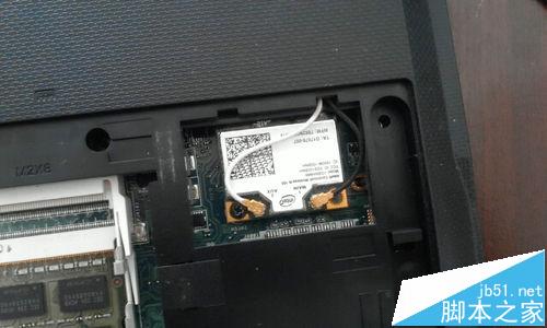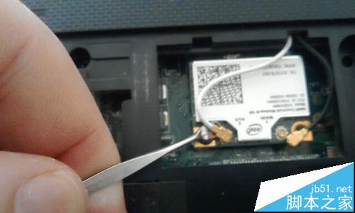 4、然后,將右側的無線網卡拆卸下來。拆時,用掏耳勺輕輕的將線向上挑起,注意黑線和白線的順序,安裝的時候不要弄混了。