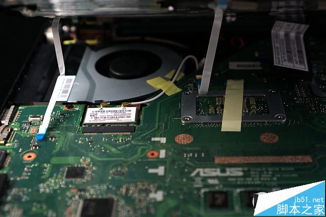 在簡單的拆卸底殼之后,我們可以仔細觀摩華碩FX50整體的內部構造。總的來說,華碩FX50機身內部結構還是比較寬裕的,主板、硬盤位等部件基本上都分布的較為均勻。散熱模塊被設計在屏幕左轉軸下面,這是目前筆記本比較流行的設計。