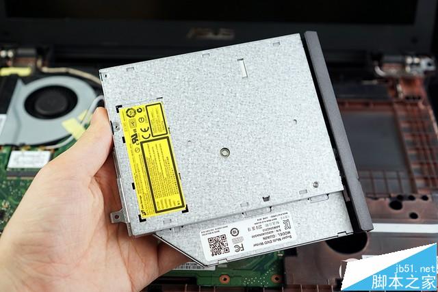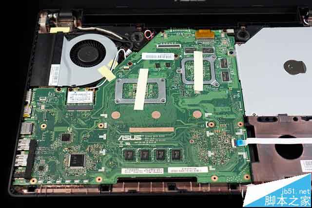 華碩FX50拆除底殼后剩余的整體,各個零部件的布局還是比較清晰明朗的。主板面積較大,并配有大號散熱風扇,內部還設計有DVD光驅位。簡單來說,該機的整體內部結構比較簡單,沒有太多復雜的連接設計,也沒有復雜的擴展設備