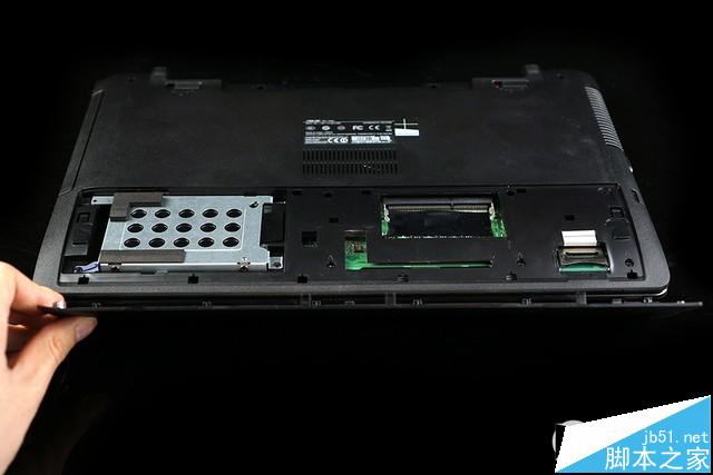華碩FX50JK的后蓋還是比較容易拿下的,不過需要注意邊框上有卡扣與機身相連,取下后蓋的時候需要拆機撬棒幫助。需要注意的是該機采用塑料材質,卡扣比較脆弱,用力不當會比較容易折斷,畢竟這部分的強度不及金屬。