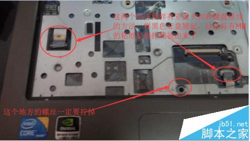 6、鍵盤那開后我們開始拆除里面的排線,首先看到圖一中的連個(gè)排線和拆除鍵盤一樣的方式拆開。這里打開壓扣后要輕輕拉動(dòng)帶有MB標(biāo)簽的粘紙就可以拿下排線了(不要扭動(dòng)排線)。圖示紅圈中的螺絲一定要擰掉。