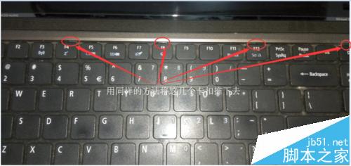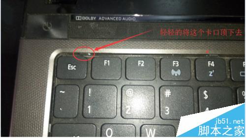 4、拆完硬盤內(nèi)存wifi后我們將筆記本正過(guò)來(lái)掀起屏幕開始拆鍵盤,大部分筆記本都是卡扣和反面的兩個(gè)螺絲來(lái)固定鍵盤,反面的螺絲我們剛才已經(jīng)取下,我們看圖中卡扣的位置,最上方有5個(gè)卡扣卡住鍵盤,我們向里輕推卡扣知道鍵盤自己翹起一個(gè)卡扣就卸完一共五步做完后我們捏起鍵盤的左邊輕輕用力向左上稍微用力左側(cè)的卡扣就下來(lái)了,右側(cè)的用同樣方法。不要急著拿下鍵盤