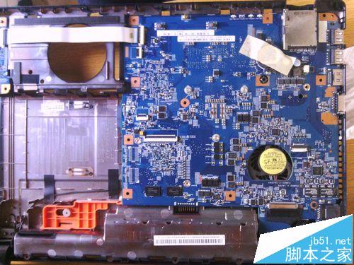 7、取下主板,由于電源接線不容易取下,所以可以不完全取下主板,將主要的數據線和接口線取下即可。主板背面就可以看到風扇了
