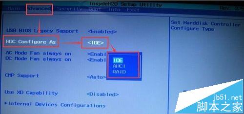2、在advanced中把光標指向hdc configure as這一行,按回車鍵,再選擇ide,按回車鍵,如圖: