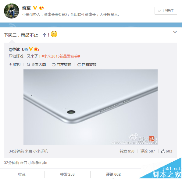 本月24日,小米將在北京國家會議中心召開“壓軸新品”發布會,目前可以確定配備指紋識別功能的紅米Note 2 Pro將跟我們見面,而它并非唯一的新品。今天晚上,小米總裁林斌在微博上自曝了一張“壓軸新品”的渲染圖,從尺寸來看這應該不是手機,結合之前的傳聞來看話,它應該就是小米平板2無疑了。