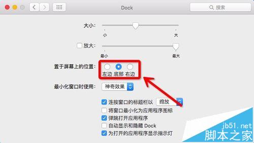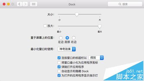 4、在Dock設置里面,我們會看到很多關于Dock桌面的設置功能,如大小、放大、位置和效果等;