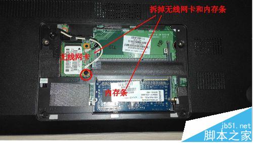 3、擰下無線網卡上1顆螺絲,并取下無線網卡與內存條(見圖)