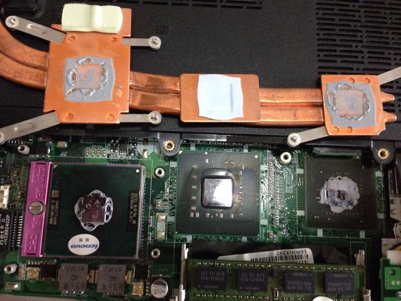 有的同學動手能力強,自己能拆電腦清理。這里要提醒大家的是,自己清理完全沒問題,前提是你別把拆下來的螺絲搞丟了,還有就是電腦里面的一些排線,從哪兒拆下來的就要接到哪里去。如果你僅僅做一個初步的清潔,毛刷吹風就可以了,但是如果你還要稍微深度一點,那么你就拆掉GPU和CPU上面鏈接的銅片,然后……然后就是上一張圖上面,你注意到了么,在鏈接CPU和GPU的地方有一團白色的牙膏狀物質,這玩意兒叫導熱硅脂,長得跟牙膏一樣,如果你沒有提前買好導熱硅脂,不要輕易拆開cpu和gpu上面的銅片和導熱銅管,如果你拆開了,而且沒注意,那么恭喜你,你的電腦馬上就會報廢。導熱硅脂非常重要,一定不要忘記。如圖: