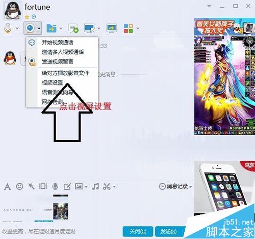 1、打開QQ,隨便打開一個聊天對話框,點擊視頻右側那個三角,會拉出一個對話框