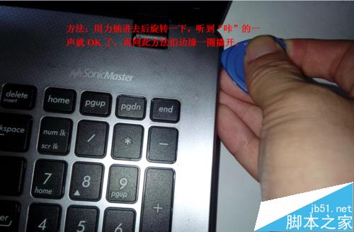 4、將本本翻過啦,用工具沿邊緣翹起C面板,如下圖