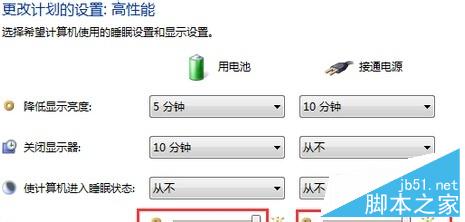 4、找到“調整計劃亮度”,在“用電池”和“接通電源”兩種模式下把滑動條拉倒最右邊,然后保存修改即可。