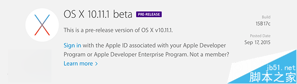 9月18日消息,繼昨天放出iOS9正式版更新升級(jí)以及固件下載后,今天蘋(píng)果再度發(fā)布首個(gè)OS X 10.11.1開(kāi)發(fā)者預(yù)覽版,具體的版本號(hào)為15B17c,而此前的OS X El Capitan GM(10.11)的版本號(hào)為15A282a。但是目前尚不確認(rèn)該Beta版本帶來(lái)了哪些省級(jí),但應(yīng)該主要集中在BUG修復(fù)、性能和穩(wěn)定性改善等。