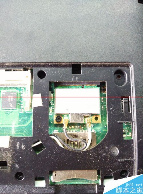 6、把無線網卡旁邊的所有螺絲旋出后,再把無線網卡上的螺絲旋出。黑線和白線拔掉之后取出無線網卡。