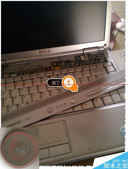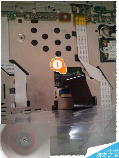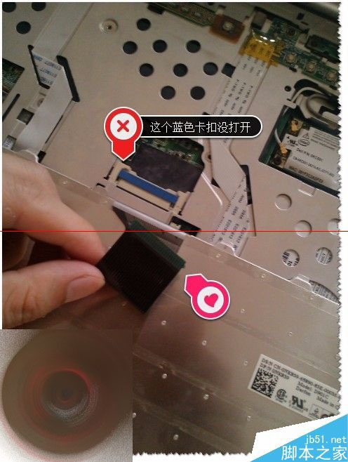 5、注意:要拆鍵盤一定要把藍(lán)色卡扣打開,才把黑色的連接線拔出來(lái)。如圖