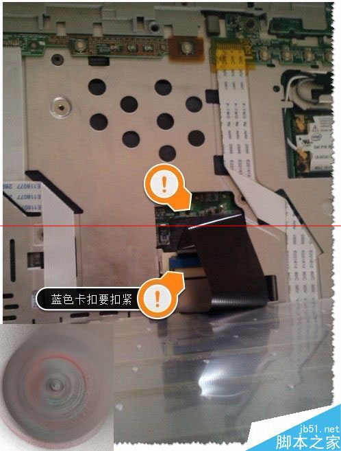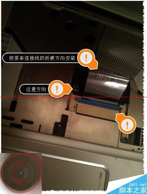 6、拆卸完成了,那么如何安裝回去呢?首先打開藍(lán)色卡扣,連接線按原來(lái)連接線的折痕方向安裝(注意方向不要裝反了)。如圖
