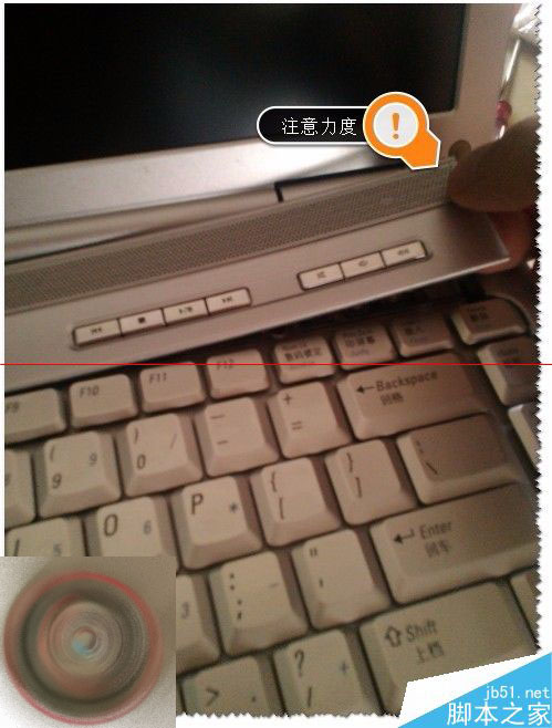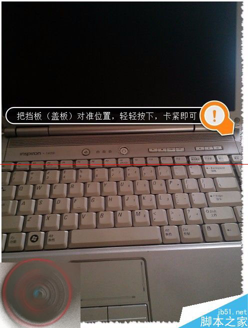 9、筆記本前開機(jī)鍵擋板(蓋板)如何安裝呢?把擋板(蓋板)對(duì)準(zhǔn)位置,輕輕按下,卡緊即可。如圖