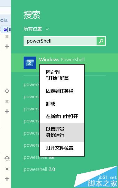 3、若您的機器出廠預裝Windows8系統,鼠標放到右下角點擊搜索,輸入powershell,右擊以管理員身份運行
