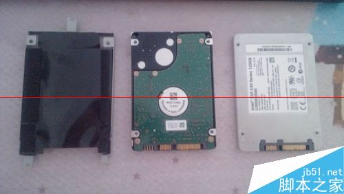 3、這張圖中左一是我們拆下來的原筆記本中自帶硬盤架,中間是筆記本自帶的硬盤,右一是我們買的ssd固態硬盤。將固態硬盤裝入原支架后再倒序裝回原位置即可