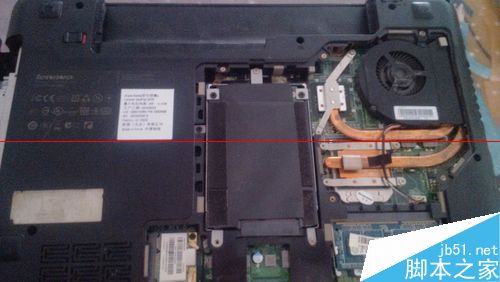 2、記得在筆記本沒關機前最好先把光驅彈出,然后關機(很重要的),切斷電源,取下電池,最好等個半分鐘以上再來開始拆除后蓋,如圖是去除了后蓋的照片。中央的那個黑色的就是筆記本自帶的硬盤,那個黑色的其實是散熱用的一層石墨,下面才是硬盤,我們要做的就是卸下螺絲,然后將硬盤連同硬盤架子向上推洞就下來了